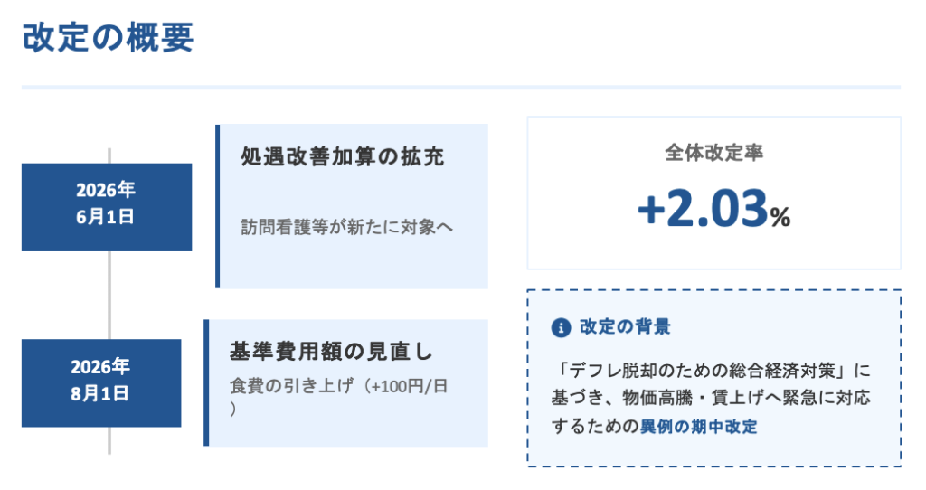 今回の改定は、物価高騰や賃上げに対応するための「デフレ脱却」を目的とした異例の期中改定です。全体の改定率は+2.03%となっており、国が本気で介護現場の処遇改善を進めようとしていることが分かります。