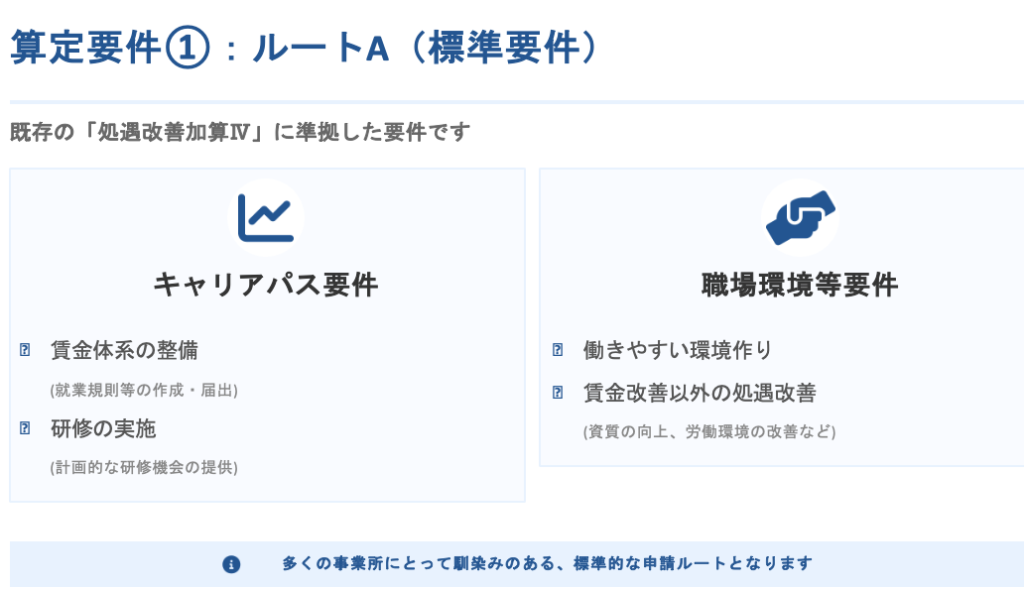 キャリアパス要件(賃金体系の整備)や職場環境等要件を満たす方法です。多くの事業所にとって馴染みのあるルートですが、事務負担は一定数残ります