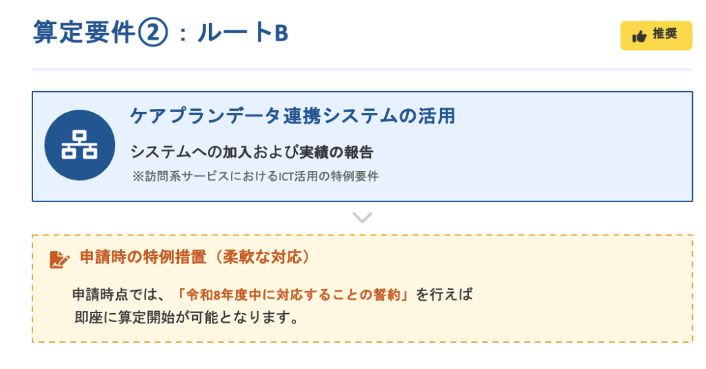 - 算定の鍵:「ケアプランデータ連携システム」の導入が推奨(ルートB)