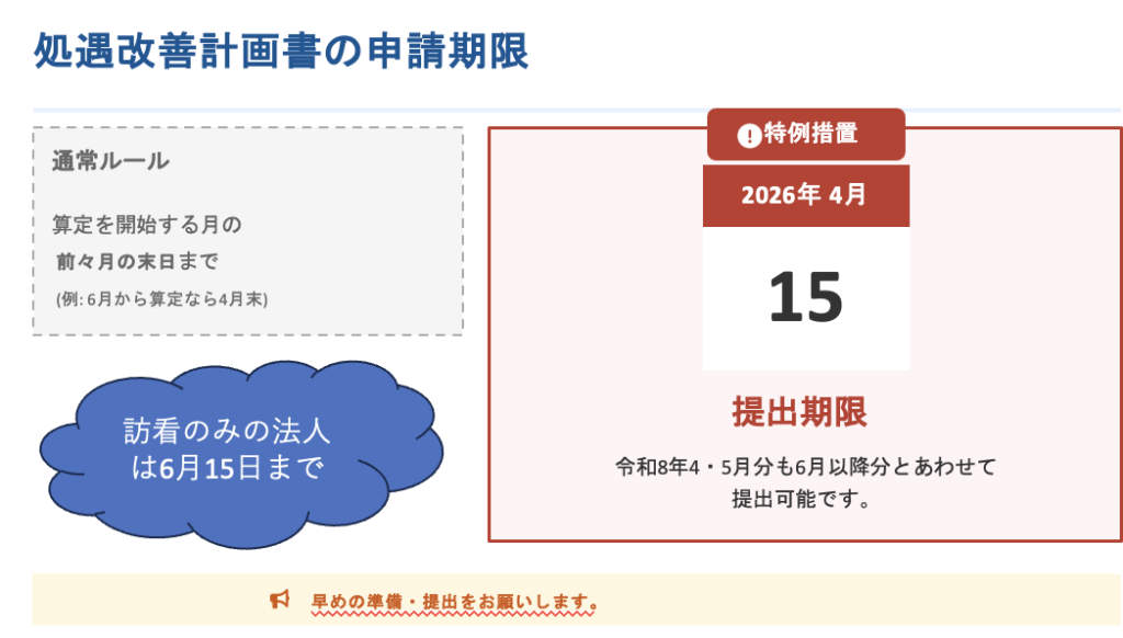 2026年6月から算定を開始するためには、原則として2026年4月15日までに計画書を提出する必要があります。まずは自社の増収額を試算し、ICT導入のスケジュールを確認しましょう。